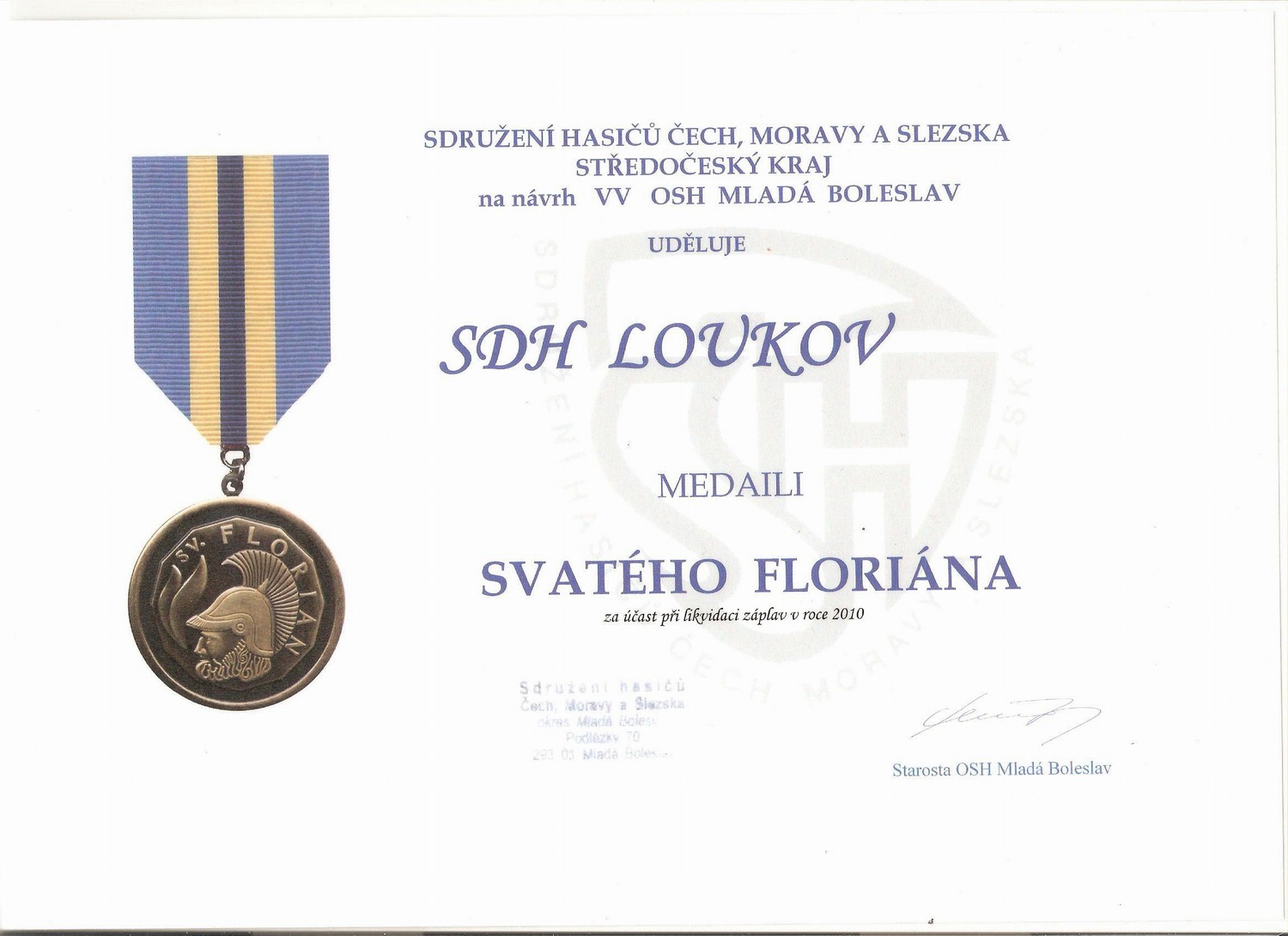 Metál upomínající na neobyčejné nasazení na své hrudi od nynějška mohou hrdě nosit členové sborů dobrovolných hasičů z Bojetic, Březiny, Březovic, Dobrovice, Dolního Bousova, Dobšína, Chotětova, Katusic, Kněžmostu, Kochánek, Kolomut, Kosmonos,